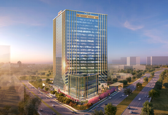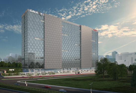 Galaxy by Auro Realty is a majestic 25-story office tower in the heart of HITEC City, Hyderabad. It stands as India's tallest corporate office building constructed with precast technology. This prime grade A office space covers 1.9 million sq. ft., featuring an elegant glass façade and contemporary design. It proudly holds a pre-certified LEED v4 Gold Rating from USGBC, emphasizing its commitment to environmental sustainability.The grand double-height entrance lobby and thoughtful design enhance the overall user experience, while landscaped open areas create a relaxing atmosphere for occupants. Galaxy promotes work-life balance, boosting employee productivity.